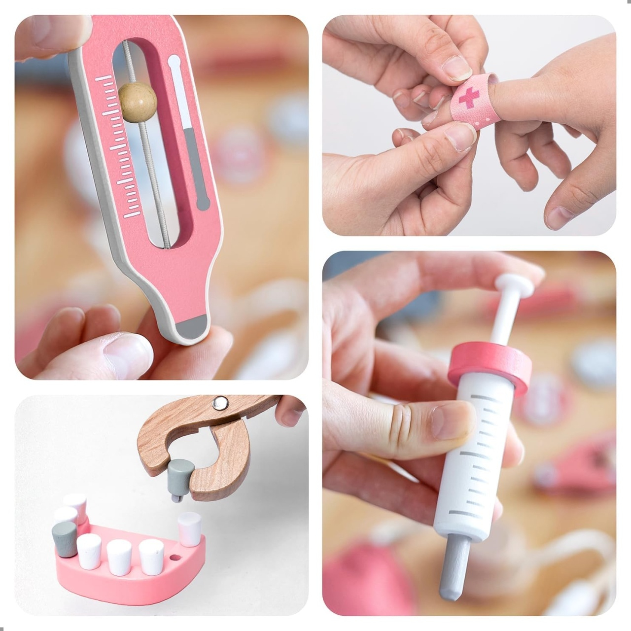 Trusa include tot ce are nevoie un doctor mic pentru a îngriji pacienții imaginari: stetoscop, termometru, ecuson personalizat, model dentar și multe altele. Copiii pot învăța despre corpul uman, grija față de ceilalți și importanța sănătății, prin joacă activă și plină de sens.