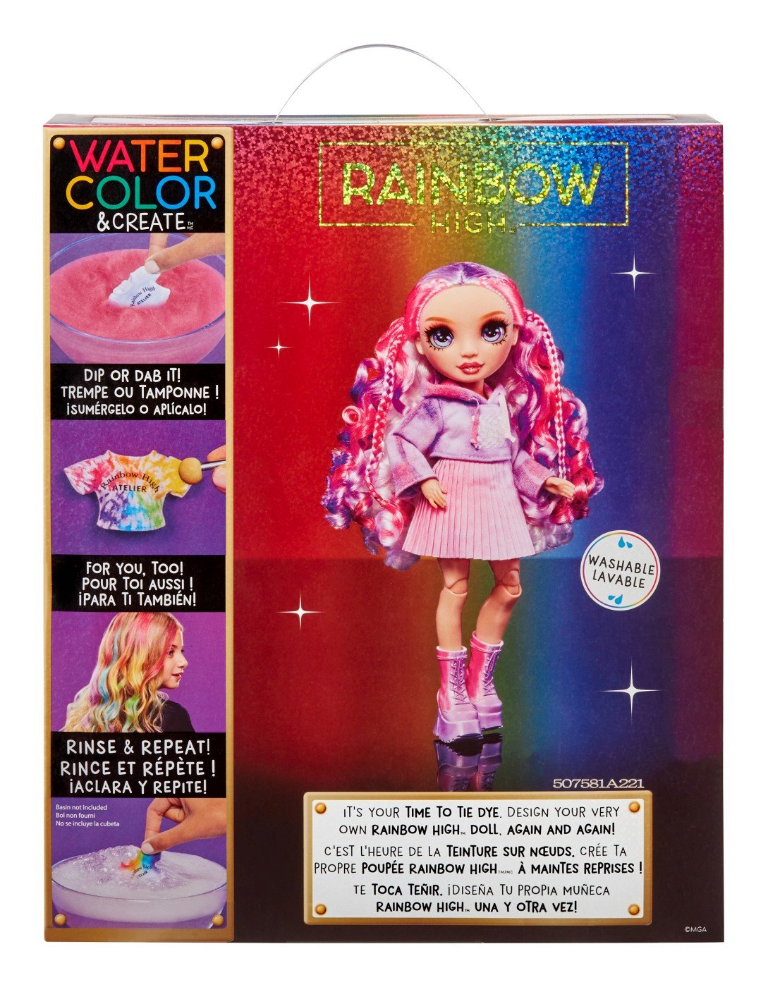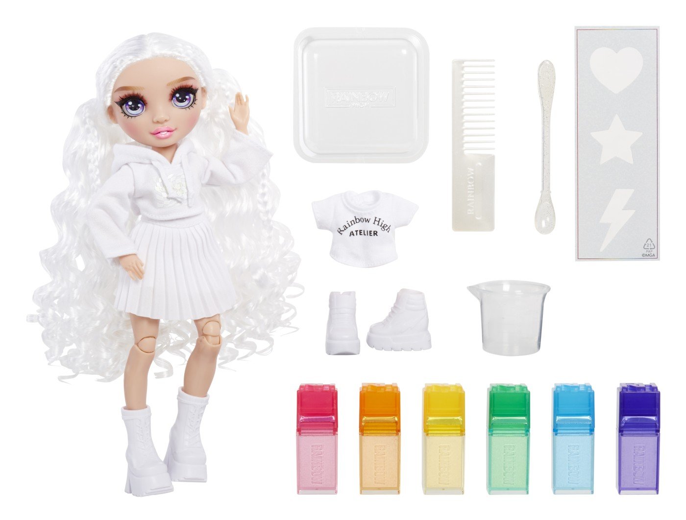 Rainbow High Watercolor & Create face extrem de usor sa-ti creezi propria papusa personalizata Rainbow High in multe moduri diferite, inclusiv cu Tie-Dye! Poti folosi acuarelele lavabile si pe propriul par! Apoi, doar clateste si repeta pentru a crea din nou.Adauga apa in cele 6 pulberi colorate pentru a crea acuarele, apoi coloreaza hainele si parul. Include 6 culori (roz, portocaliu, galben, verde, albastru si violet) pentru a face atat de multe desene colorate. Este atat de simplu!Pentru desene precise, aplica acuarelele folosind buretele cu doua capete direct pe haine si par. Atatea moduri de a te distra!Include elastice pentru a crea modele amuzante de tie-dye - spirale, straturi si multe altele.Sabloanele fac usor sa creezi forme amuzante pe par si haine.In plus, fata de papusa imbracata intr-o tinuta alba (hanorac cu gluga, fusta pliata si pantofi albi), primesti si un tricou si pantofi bonus.Este atat de usor sa repeti procesul. Pur si simplu spala cu apa si sapun, lasa sa se usuce si incepe din nou sa creezi!Coloreaza-ti si tu parul! Doar aplica pe suvite pentru a adauga culoare parului tau. Nota culoarea va fi mai vibranta pe parul mai deschis!Papusa Watercolor & Create are par lung si frumos cu bucle si o impletitura in partea de sus, gene lungi si ochi din sticla. Colectioneaza intreaga gama de papusi Watercolor & Create.Este inclusa 1 papusa exclusiva cu o tinuta complet alba si incaltaminte pentru papusa plus tricou si pantofi bonus, 6 acuarele lavabile colorate, burete cu doua capete, elastice, sablon, pahar de masurare, bol de unica folosinta, lingura si pieptene.Fiind complet articulata, este super distractiva si usor de personalizat. Capul, bratele, mainile si picioarele se indoaie pentru multe pozitii amuzante, inclusiv spagatul! O poti expune pe suportul inclus pentru papusa.