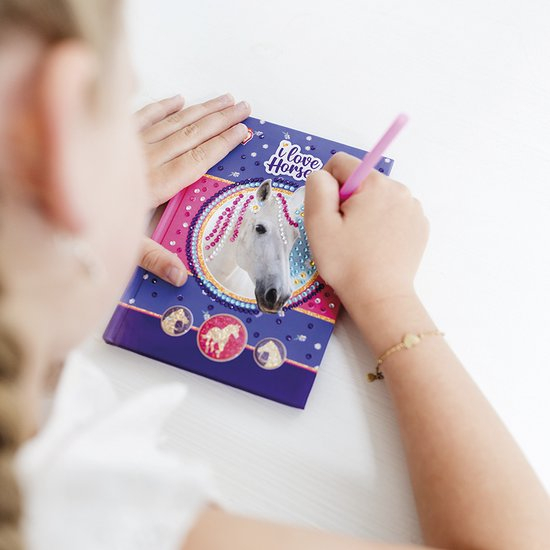 Un jurnal cu tema I Love Horses cu coperta decorata prin tehnica Diamond Painting. Perfect pentru copiii pasionati de cai si arta DIY.
