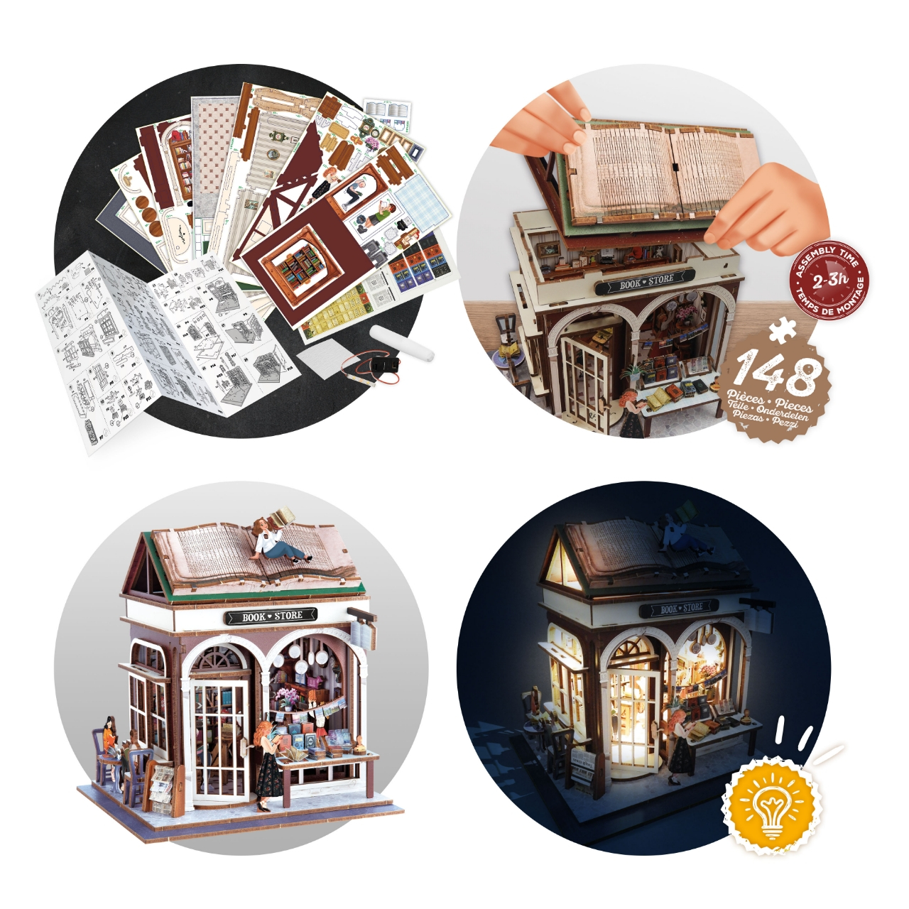 Asamblați piesele din lemn și construiți-vă propria librărie în miniatură. Lipiți și așezați mobilierul, accesoriile, plantele și cărțile pentru a recrea atmosfera confortabilă a unei librării.