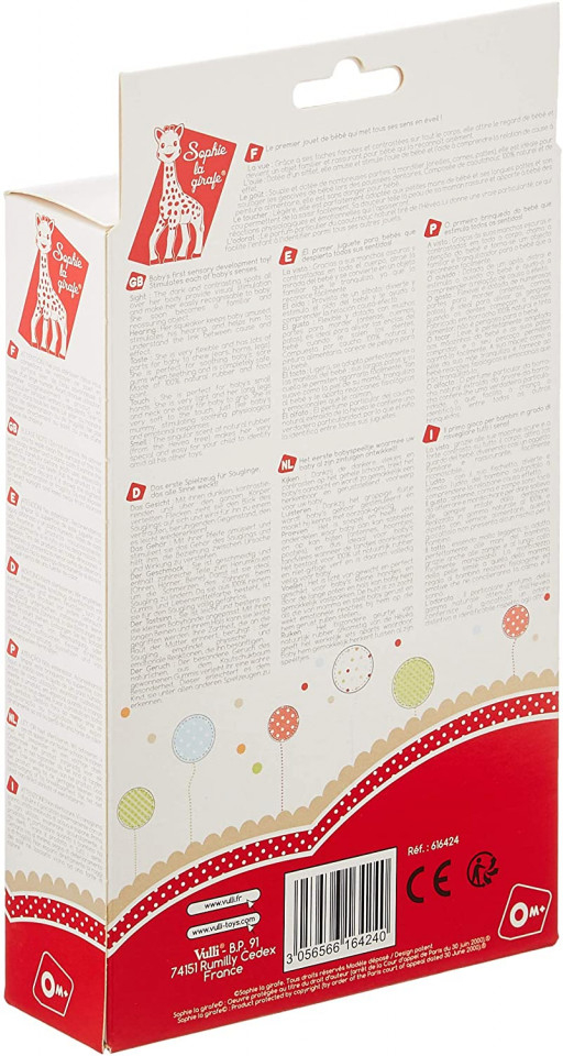 In plus, cutia contine si un card pe care parintii il pot completa pentru a-l pastra drept amintire.Girafa Sophie poate fi utilizata de la 0 luni