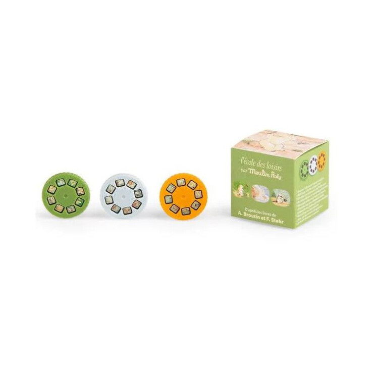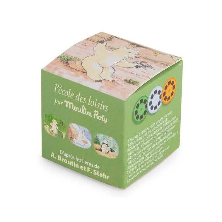 Rezerve pentru lanternă cu poveşti Conține 3 discuri cu ”diapozitive”, fiecare conținând 8 imagini cu povești din colecția Ecole de loisirs . Distrează-te inventând o lume de basme împreună cu copilul tău. Compatibile cu orice model de lanternă Moulin Roty.