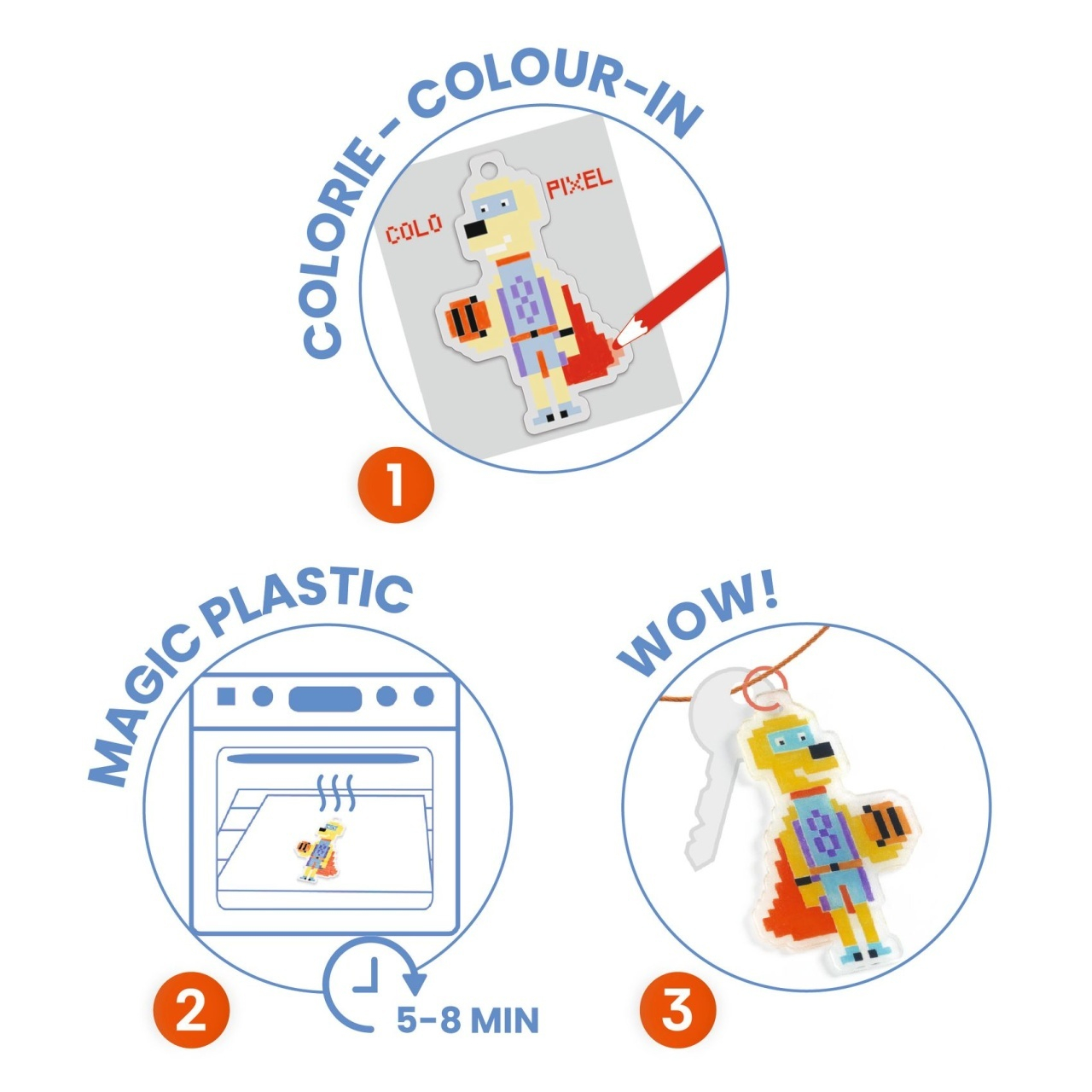 Copiii colorează siluetele transparente cu creioanele incluse, folosind șabloanele ca ghid, apoi le introduc în cuptor pentru a observa cum plasticul se micșorează și se întărește, transformându-se în piese solide și colorate. Odată terminate, brelocurile se asamblează cu ajutorul inelului și a șuruburilor incluse, creând accesorii unice și funcționale.