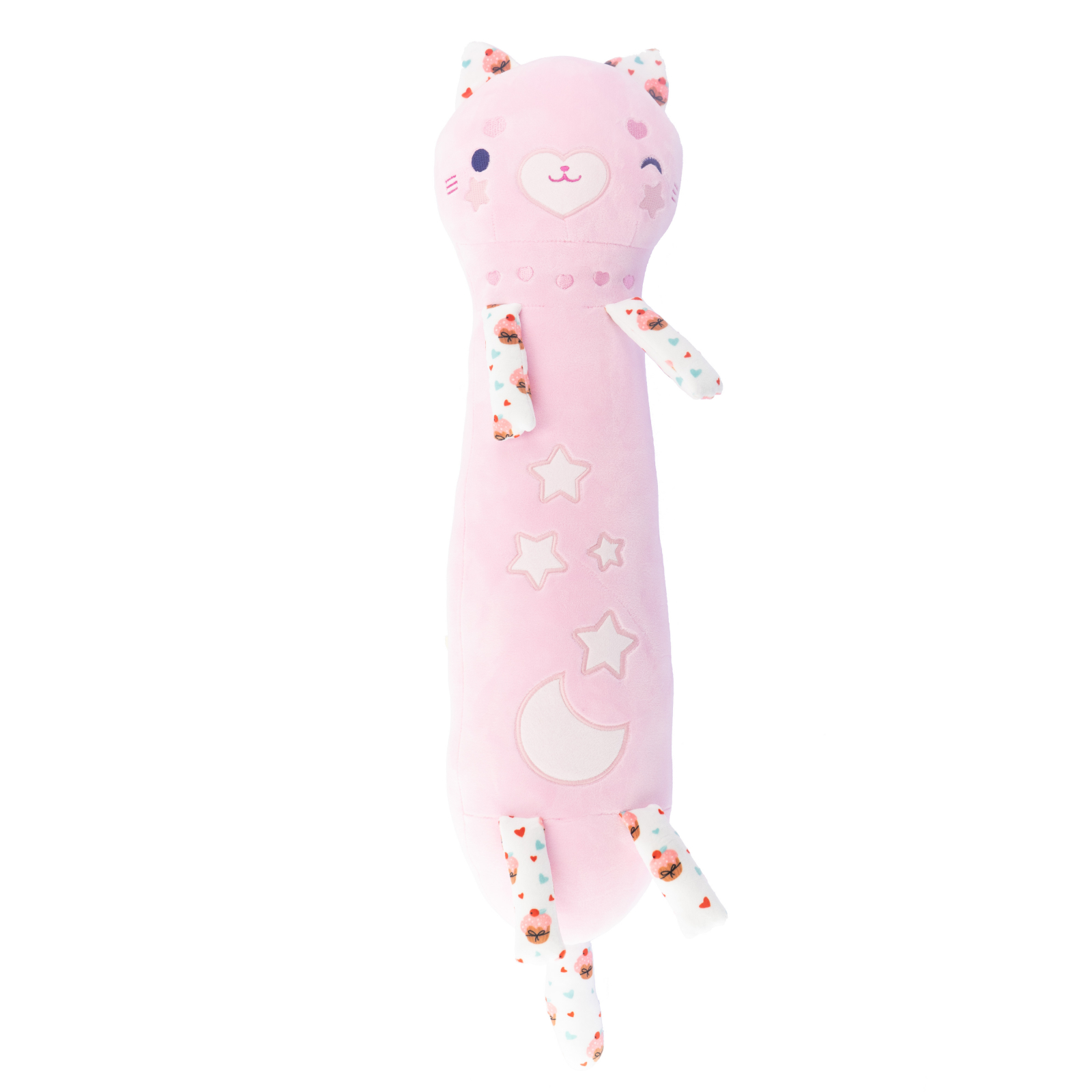 Momomi Cisai este o pisicuță de pluș adorabilă, în stil kawaii, cu o lungime de 60 cm, ideală pentru copii și nu numai. Este moale, colorată, netedă și incredibil de plăcută la atingere – perfectă pentru îmbrățișări, somn, relaxare sau ca obiect decorativ. Fiecare model vine cu un detaliu brodat (lună, stea sau inimă) care luminează în întuneric după expunere la lumină.