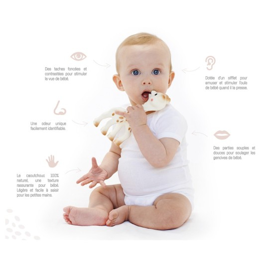 Sacosa Cadou Din Bumbac contine girafa Sophie (18 cm), zornaitoare (12 cm) si inel de dentitie cu aroma de vanilie  (8 cm).