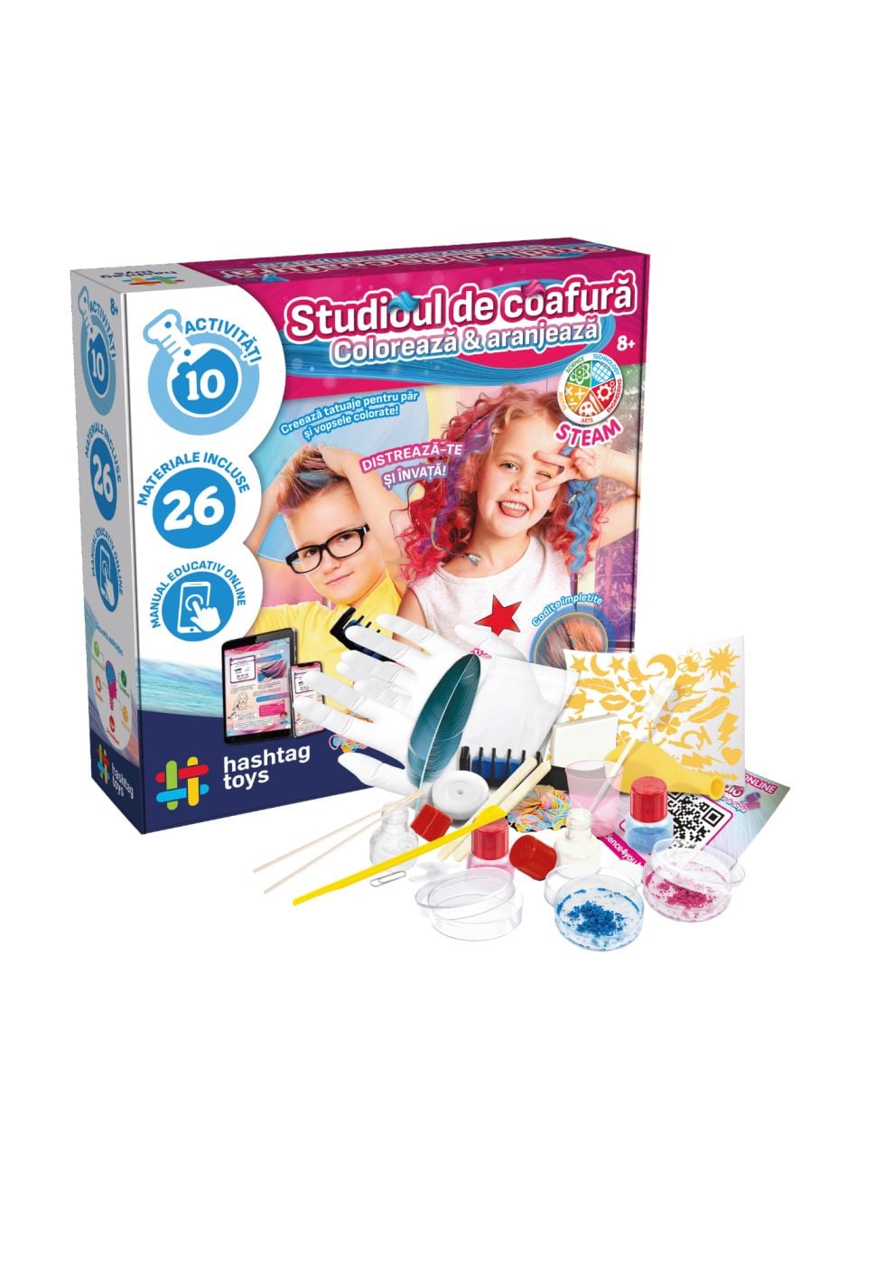 Creeaza-ti propriile vopsele de par si fa-ti tatuaje fantastice cu acest STUDIO DE COAFURA COLOREAZA SI ARANJEAZA care te va introduce in lumea modei! Vei invata cum sa realizezi diferite coafuri si sa iti colorezi parul cu nuante unice, pe care le poti schimba dupa o singura spalare! Pune-ti creativitatea la incercare si descopera activitatile experimentale care iti vor face parul sa stea &bdquoin varful capului&rdquo de uimire!