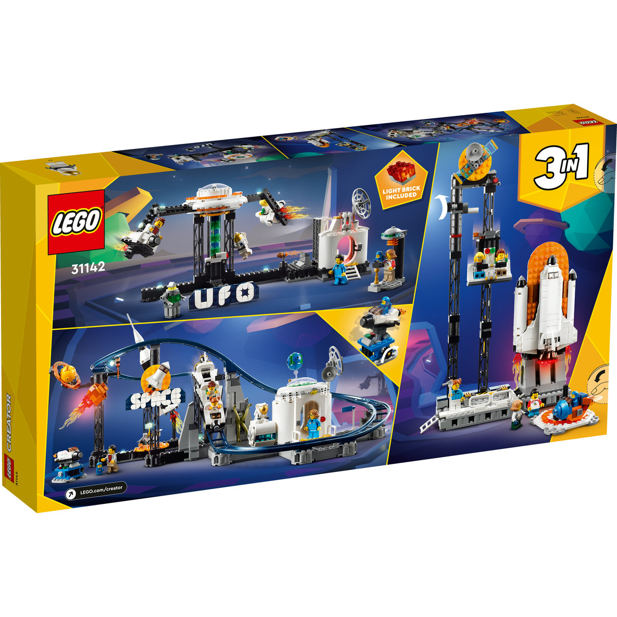 Fanii spatiului de 9+ ani se bucura de o cursa palpitanta într-un parc de distractii cu setul extrem de detaliat LEGO® Creator 3 în 1 Roller-coaster spatial (31142). Setul include o sina serpuitoare de roller-coaster, cu 3 vagoane mobile pentru curse distractive, care trec în viteza pe lânga o racheta spatiala decorativa, modelele planetelor Saturn si Pamânt, o baza lunara si o stea cazatoare. Setul include si un meteorit interesant, cu o caramida luminoasa care poate fi aprinsa, precum si 5 minifigurine.