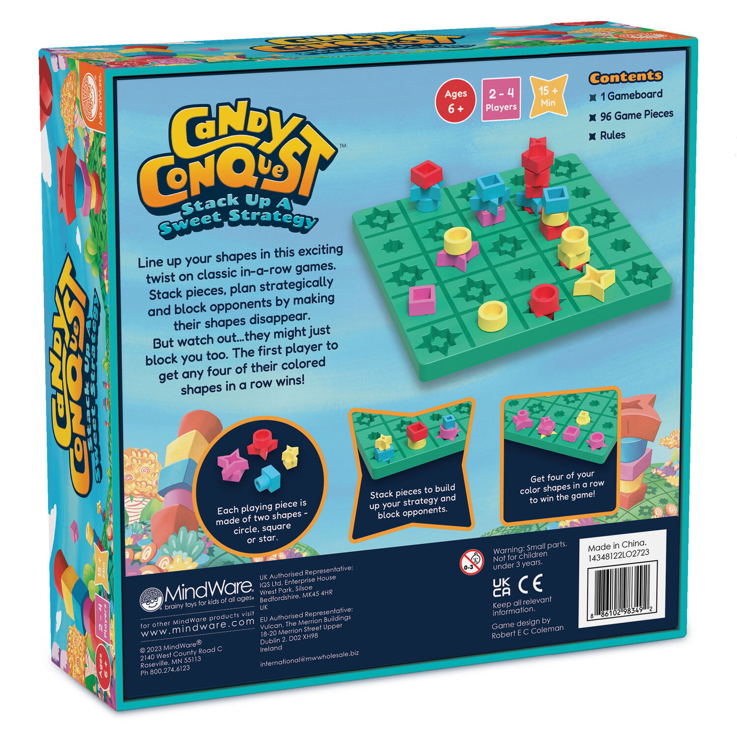 O noua versiune antrenanta a jocurilor clasice de tip in-line, Candy Conquest te va pune sa stivuiesti, sa elaborezi strategii si sa-ti depasesti adversarii in cautarea victoriei. Asezati-va formele colorate in mod strategic pe tabla sau stivuiti-le deasupra pieselor adversarilor, facand ca formele lor sa dispara in mod magic. Dar aveti grija! Rivalii vostri sunt gata sa va blocheze calea spre triumf, transformand jocul intr-un test palpitant de inteligenta. Planificarea atenta si gandirea critica necesara fac din Candy Conquest o alegere excelenta pentru acasa sau in clasa, facand parte din categoria jocurile de societate educative pentru copii. Cu reguli simple si un mod de joc usor de invatat, acest joc se adreseaza atat jucatorilor experimentati, cat si celor noi in lumea jocurilor de societate. Vei fi primul jucator care va reusi sa conecteze cu indemanare patru dintre formele tale la rand si sa te rasfeti cu gustul dulce al succesului?