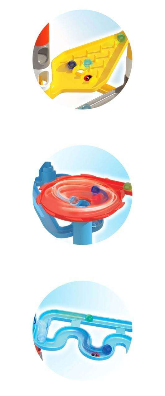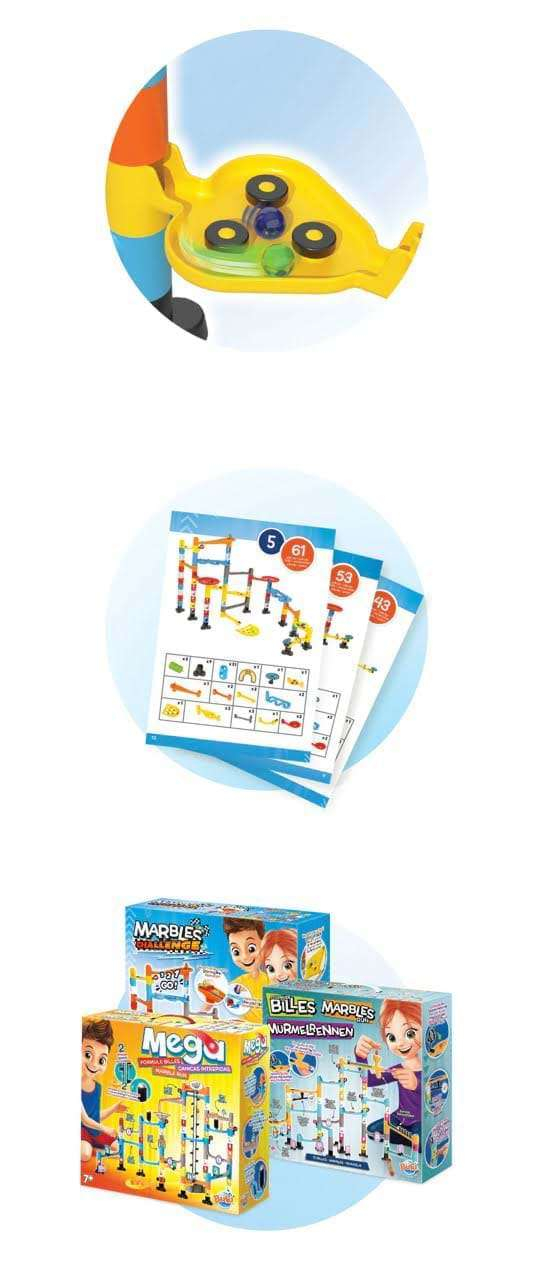 Asamblati labirintul, alegeti bila colorata si asezati-o in pozitia de Start, alaturi de bilele celorlalti jucatori. Urmariti cursa si treceti de obstacole! Folositi burduful pentru a accelera sau a incetini bilelele in traseul lor. Cine va castiga cursa?