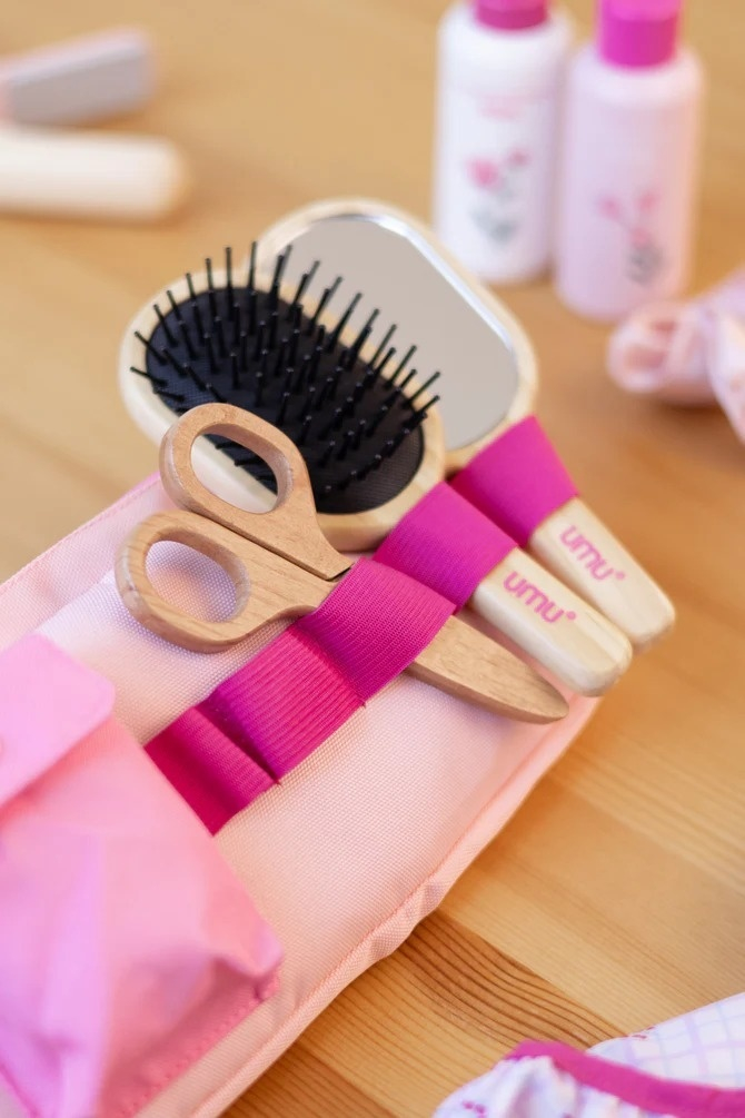 Conține: Centură reglabilă pentru unelte Geantă pentru instrumente Pulverizator de apă Foarfecă Placă pentru îndreptat părul Oglindă Pieptene Uscător de păr Alte accesorii pentru joacă creativă