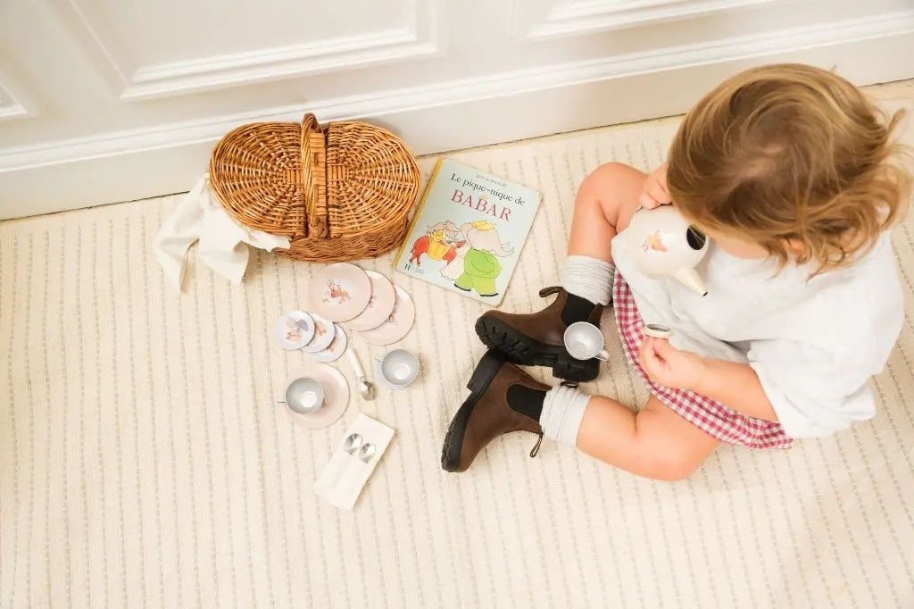 Set retro de ceai pentru a invita prietenii la o petrecere imaginară. Împachetat într-un coș elegant din răchită naturală, acest set include elemente clasice - cești, farfurioare, o ceainic vintage și accesorii - toate decorate cu ilustrații prietenoase care inspiră povestiri jucăușe și momente de socializare prin joc.