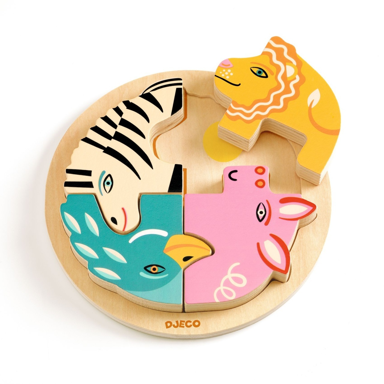 Cu design circular ingenios și ilustrații prietenoase, puzzle-ul Rondo invită copilul să descopere lumea animalelor într-un mod natural și intuitiv. Și distracția nu se oprește aici! Piesele groase pot fi așezate în picioare, transformându-se în personaje de joacă și deschizând ușa către povești imaginative.