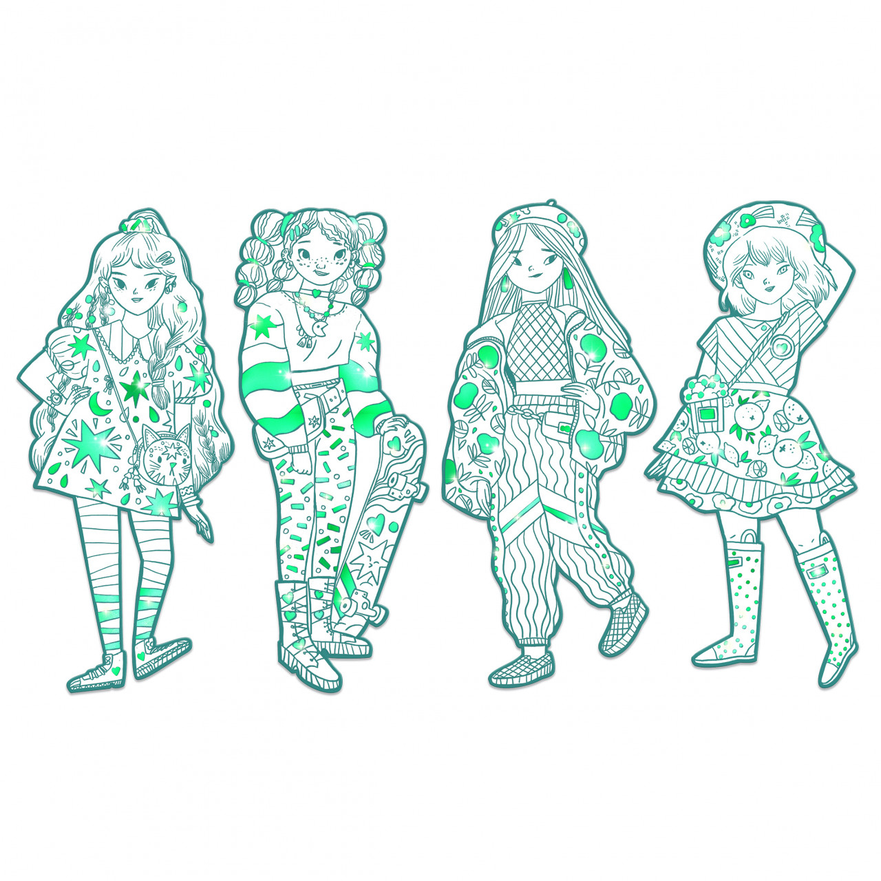 Parada modei de colorat, Angel & prietenele O paradă a modei cu ținute pe care le poți colora după cum îți place! Patru contururi mari (32 cm înălțime) oferă ținute acoperite cu modele și împodobite cu zone strălucitoare pentru a face modelele și mai atrăgătoare! Carton groas pentru a vă păstra creațiile pentru o perioadă lungă de timp.