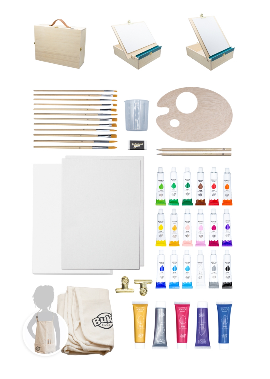 Continut: 1 cutie, 1 șorț de artist, 2 pânze subțiri (format A4), 5 coli de hârtie A4 de 230 g, 2 cleme metalice pentru fixare, 12 pensule de diferite forme și dimensiuni, 1 radieră, 1 creion HB, 1 creion 2B, 1 paletă de lemn cu recipient, 18 tuburi a câte 22 ml de vopsea acrilică și 5 tuburi a câte 20 ml de vopsea cu sclipici și 1 ghid cu ilustrații color.